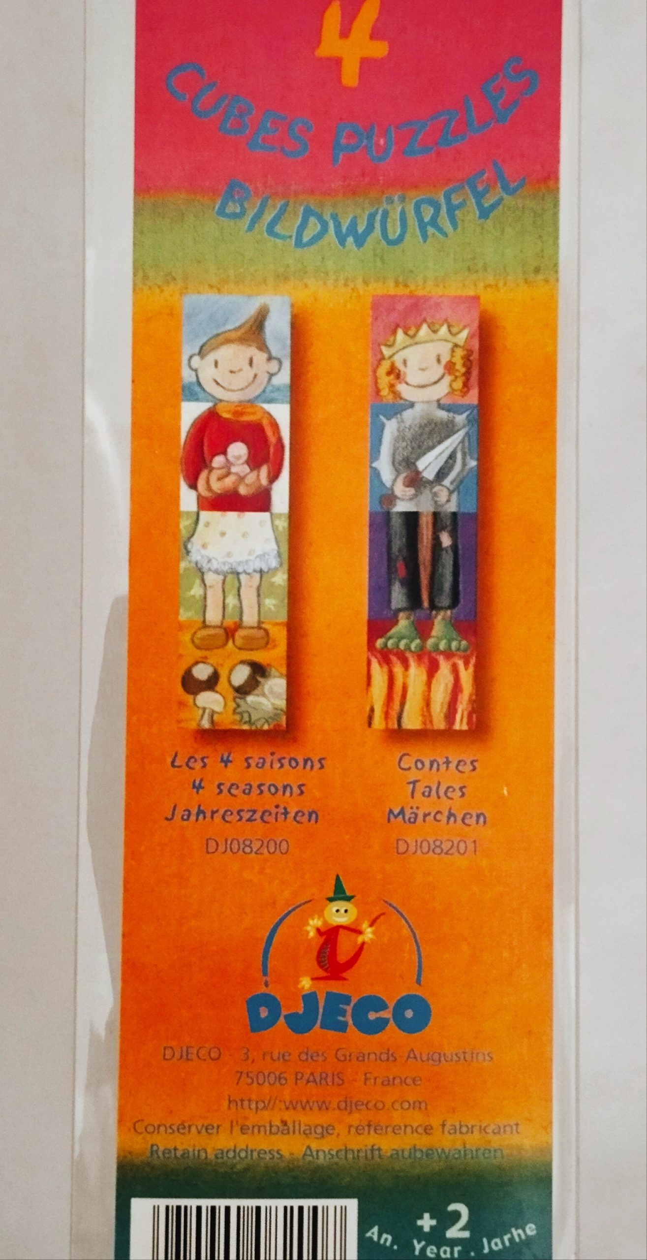 Coffret de la marque Djeco, comprenant 4 cubes puzzles pour apprendre les saisons ou imaginer les contes avec les différents personnages. Chaque cube mesure 6 cm. Adaptés aux enfants de plus de 2 ans.